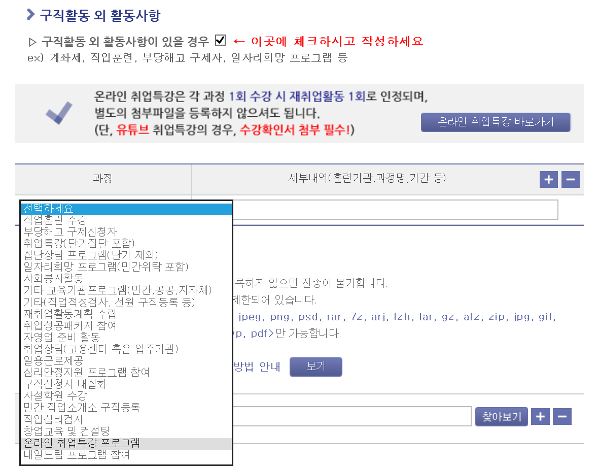 온라인 수강은 구직활동 외 활동사항으로 과정 중 온라인 취업특강 프로그램을 선택✅
